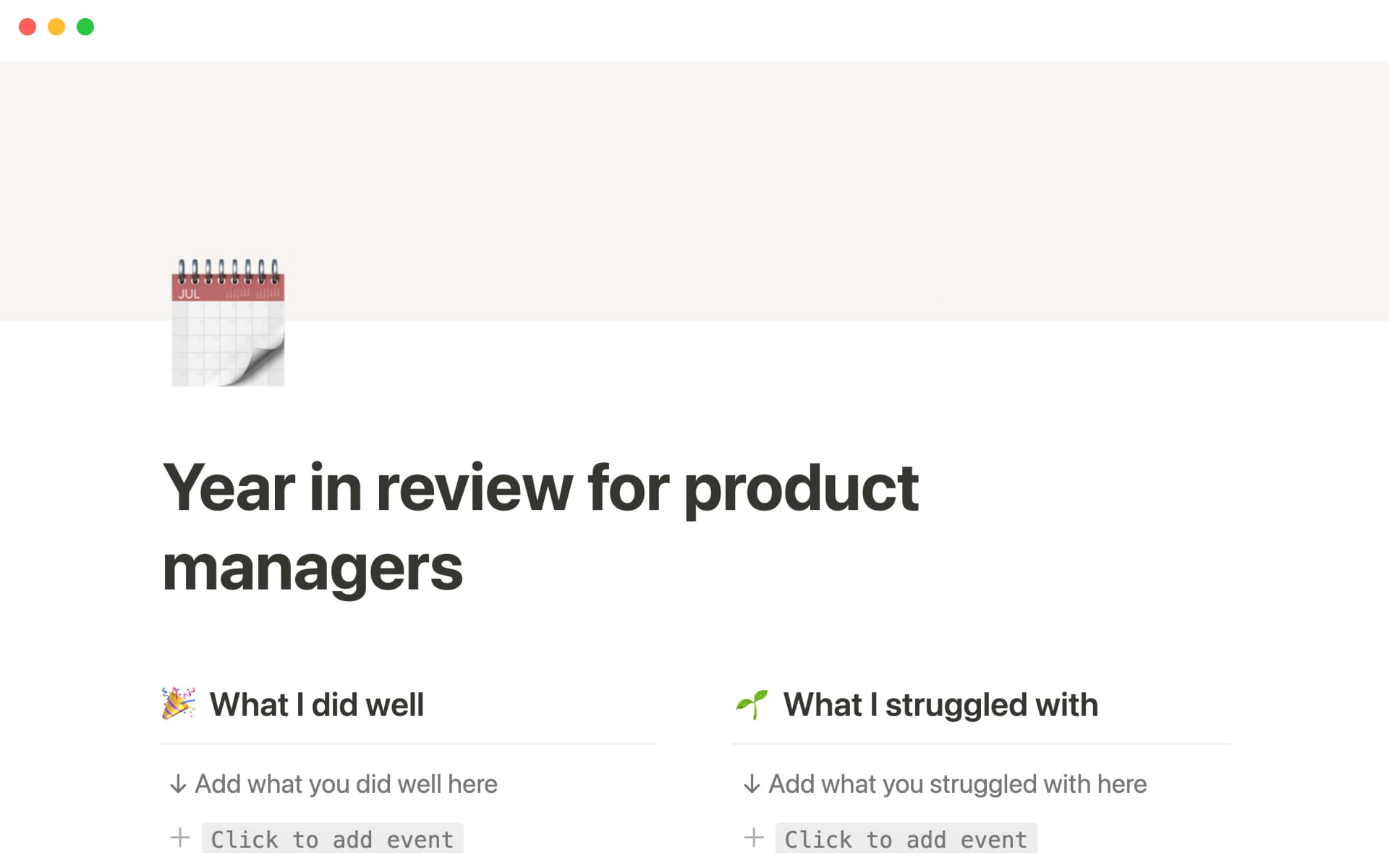 Retrospectives and OKRs are often used to gauge a product's success, so why not use the same system for yourself? This template from Product School helps you quickly see what worked and what didn't, and how to create an upgraded plan of action for the coming year. Just like with a team's OKRs, you can use the connected databases for your own objectives and key results and see your progress bars filling up as you reach your targets.